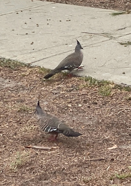 This is a Crested Pigeon. The peak on his head and the iridescent feathers make him look really fancy. I took a picture in the park, but it doesn't look nearly as good as this one: